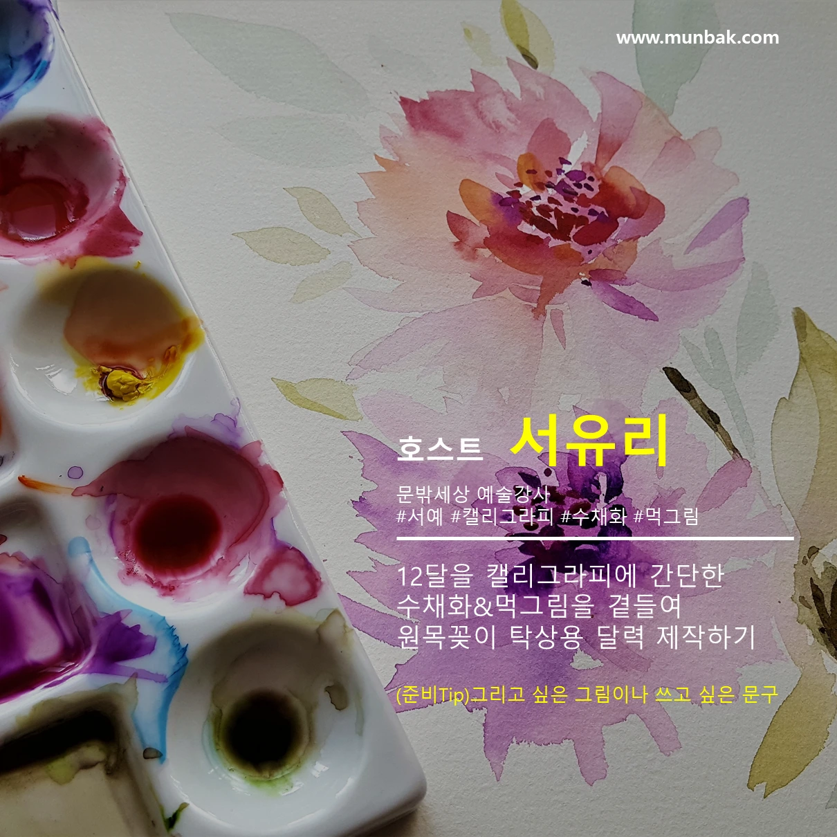 한 장 한 장 다달이 12달을 캘리그라피로 원하는 문구를 쓰고 수채화&먹그림으로 예쁘게 꾸며 원목꽂이 탁상용 달력을 제작해 볼 수 있는 시간입니다. 한 장도 아닌 무려 열 두장을 완성해나가야 하는만큼 다른 살롱과 달리 유일하게 4시간 동안 진행되는 워크숍입니다. 신년엔 뜻하는 일들이 마법처럼 모두 다 이루어질 수 있기를 바라며, 2019년 달력을 직접 만들어보면 어떨까요?