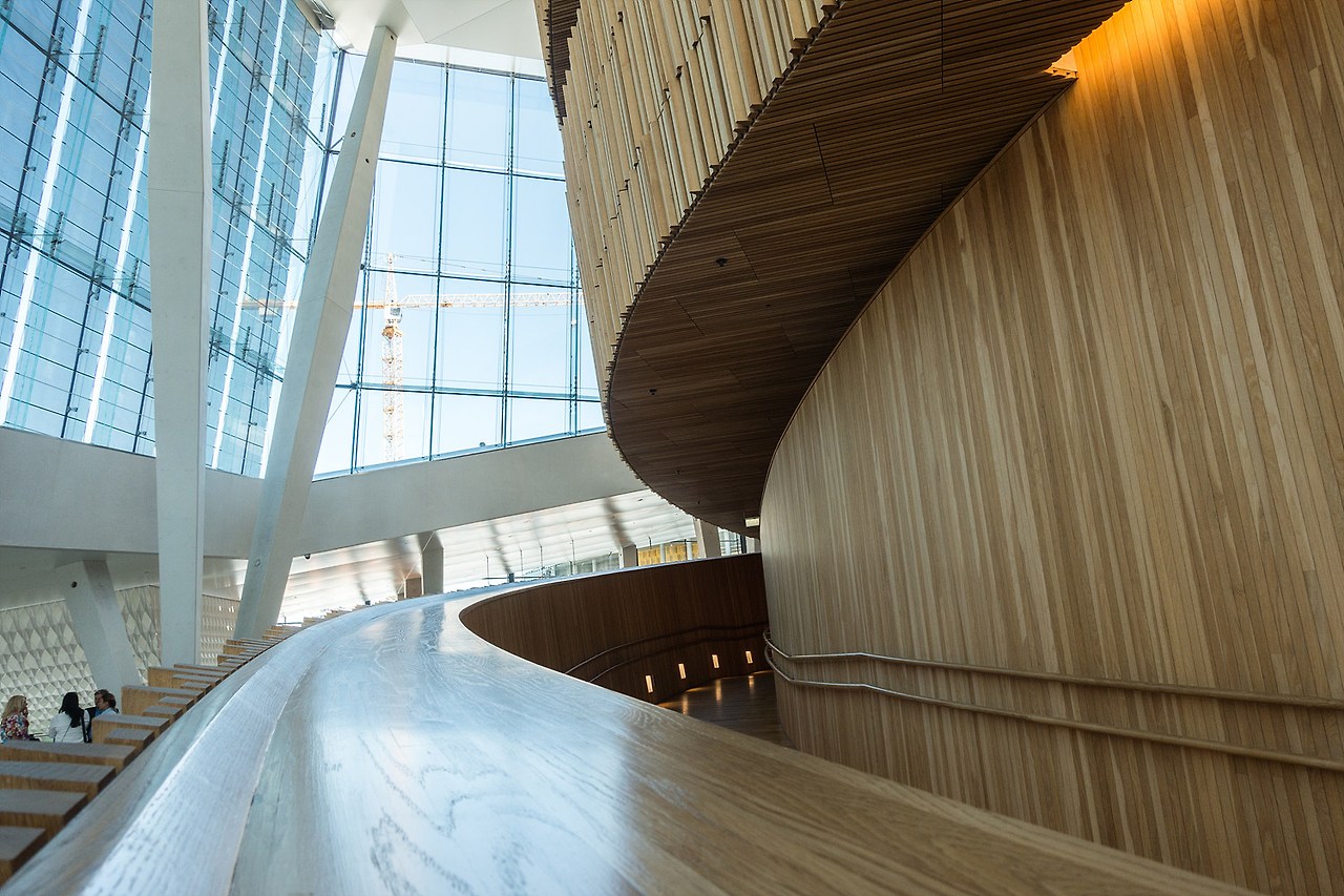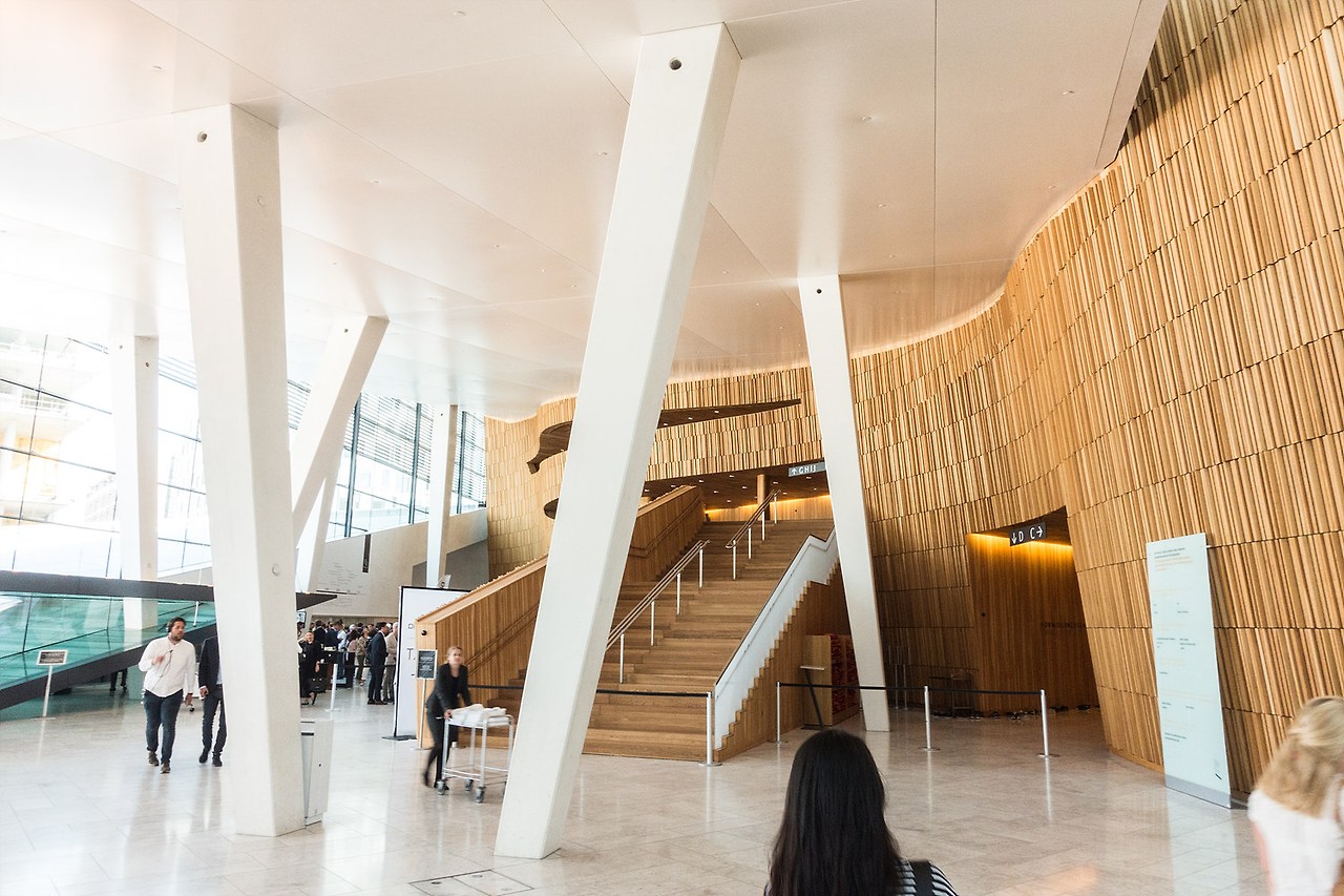 오페라 하우는 설산의 장엄하고 차가운 이미지에 비하면 내부는 친근한 나무 소재를 활용해 따뜻하고 부드러운 공간을 연출했다. 발틱 오크를 사용한 오디토리움 벽과 노르웨이 전통 배를 만드는 장인이 직접 깎아 만든 계단은 내부 인테리어의 완성도를 높여준다. 또한 입구부터 한눈에 들어오는 오페라 하우스의 내부 전경과 천정은 방문객으로 하여금 위압감을 줄이고 친근함을 준다. 그 외에도 현대적이면서 아름다운 오페라 바, 모던한 화장실 디자인 등 작은 부분 하나까지 디자인의 디테일은 놀라웠다.