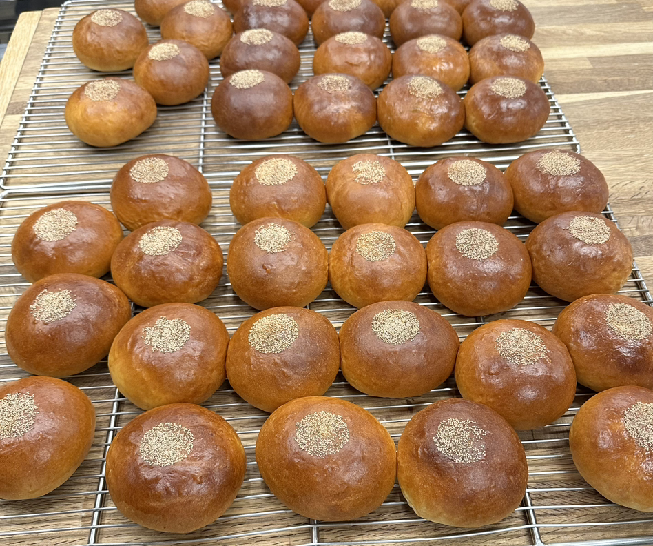 이 과정을 반복하다 보면 어느새 수십 개의 팥빵이 팬 위에 먹음직스럽게 놓여 있다. 2차 발효를 마친 후 빵의 윤기를 더하기 위해 표면에 계란물을 붓으로 발라주고, 정중앙에 깨를 뿌리면 오븐에 넣을 준비가 끝난다.