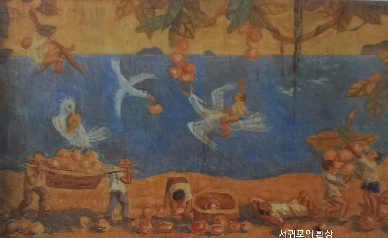 서귀포의 환상이라는 이 작품은 제목처럼 보는 이에게 행복한 꿈을 꾸게 한다. 나무 합판에 유화로 그린 이 그림은 파란 바다를 배경으로 귤나무에서 귤을 수확하면서 새를 타고 귤을 따는 아이 등 자유롭고 행복한 느낌을 갖게 하는 그림이다. 멀리 서귀포에서 자주 볼 수 있는 섶섬이나 문섬등이 보인다.