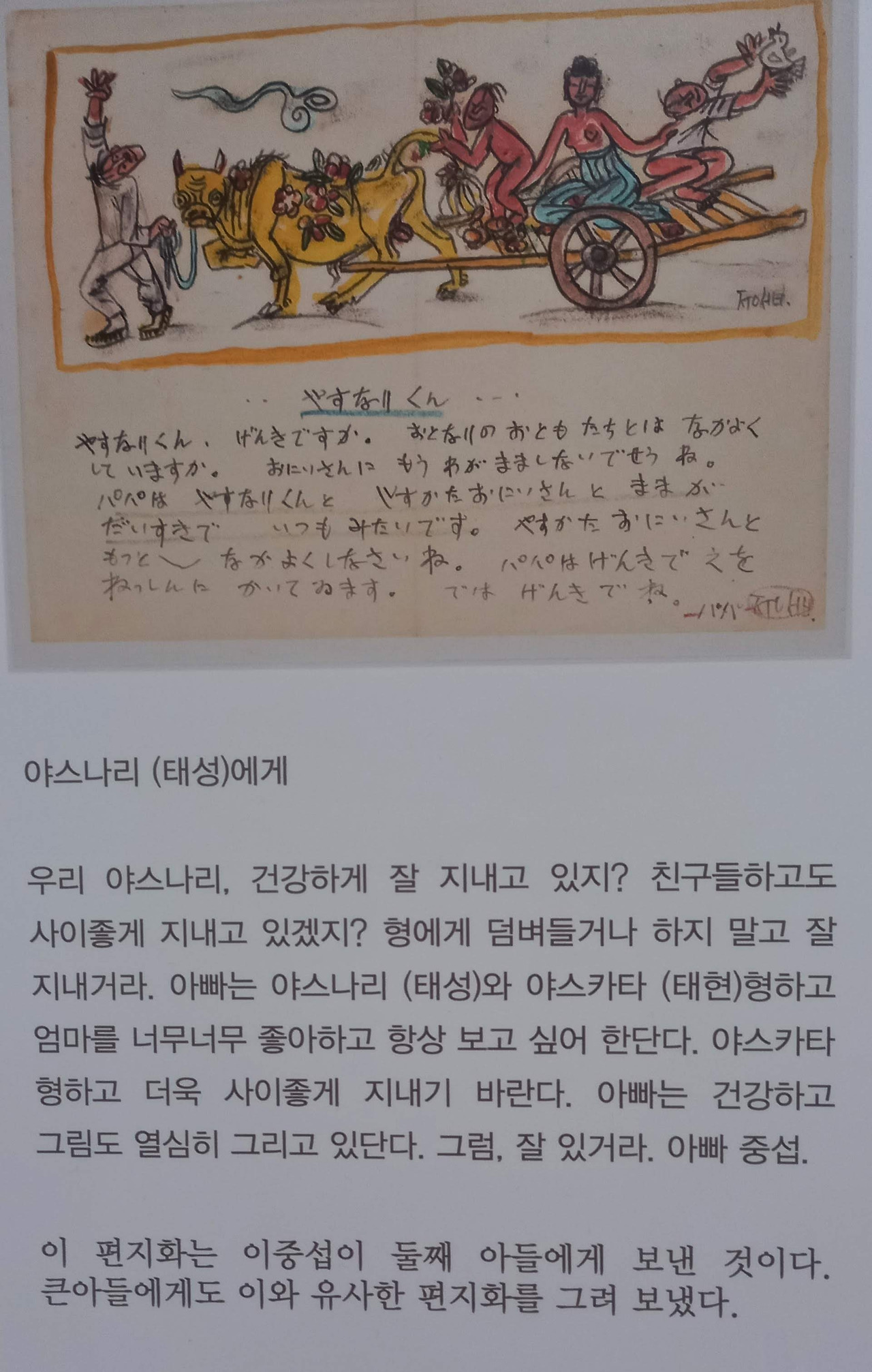 아이들과 아내를 걱정하면서 어떤 재료든 이용해서 작품을 그리며 자신을 지탱했을 그의 모습이 머리에 그려지면서, 아이들을 그리워하며 쓴 편지에 처음 그렸다는 '길 떠나는 가족'을 보자 가슴이 먹먹했다. 이 그림은 유화로 그리기 전 밑그림으로 흥겨움이 느껴진다. 가족을 소 달구지에 태우고 작가는 황소를 끌면서 따뜻한 남쪽나라로 가는 풍경이라고 한다.
