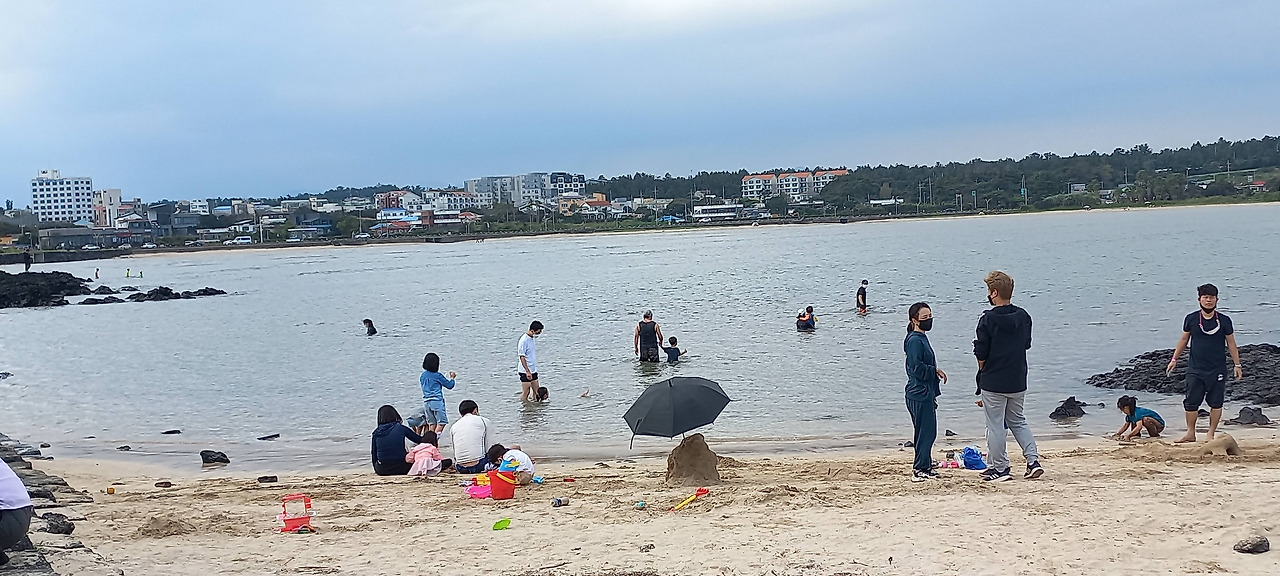 고운 모래에 물이 얕아서 베토와 할아버지는 물속에 들어가 수영을 하고 우리는 해안에 앉아 사진을 찍어주었다. 10월이라 아무리 제주도라지만 수영할 일은 없을 줄 알고 베토의 수영복을 챙겨 오지 않았다는데 해변에만 오면 물에 들어가고 싶어 하는 베토를 말리지 못해 걱정이 된다. 다행히 갈아입힐 옷을 챙겨 왔으니 타월만 2장 근처 편의점에서 사다가 물속에서 놀다가 나오는 베토를 닦아주고 옷을 입혀 버스를 타고 돌아왔다.