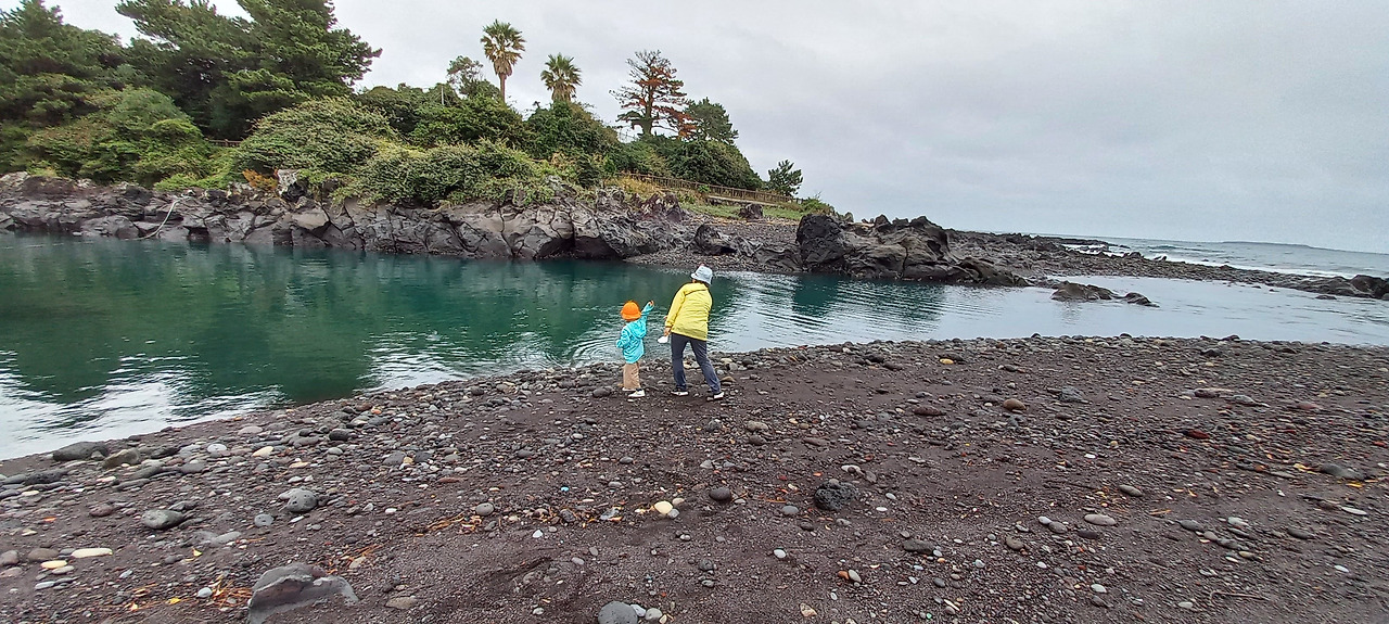 쇠소깍은 초록색의 깊은 물을 사이에 두고 양쪽이 여러 가지 모양의 돌병풍으로 둘러싸여 있다. 그위로 숲이 우거져 신비한 계곡에 온 느낌이었다. 라라가 예약체크를 하고 구명조끼를 베토까지 모두 입고 조각배를 타기 위해 산책로를 따라 내려갔다.