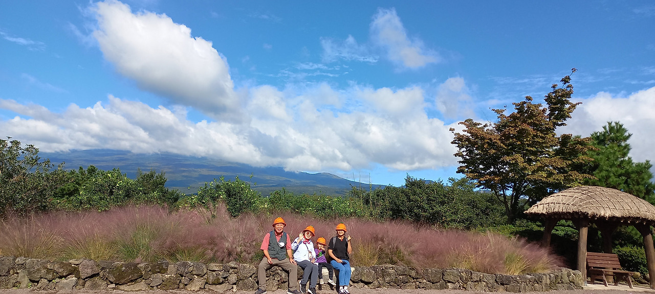 멀리 한라산과 오름들위에 구름이 걸려있고 하늘이 푸르고 맑다--공원을 걷다가 잠시 쉬면서.