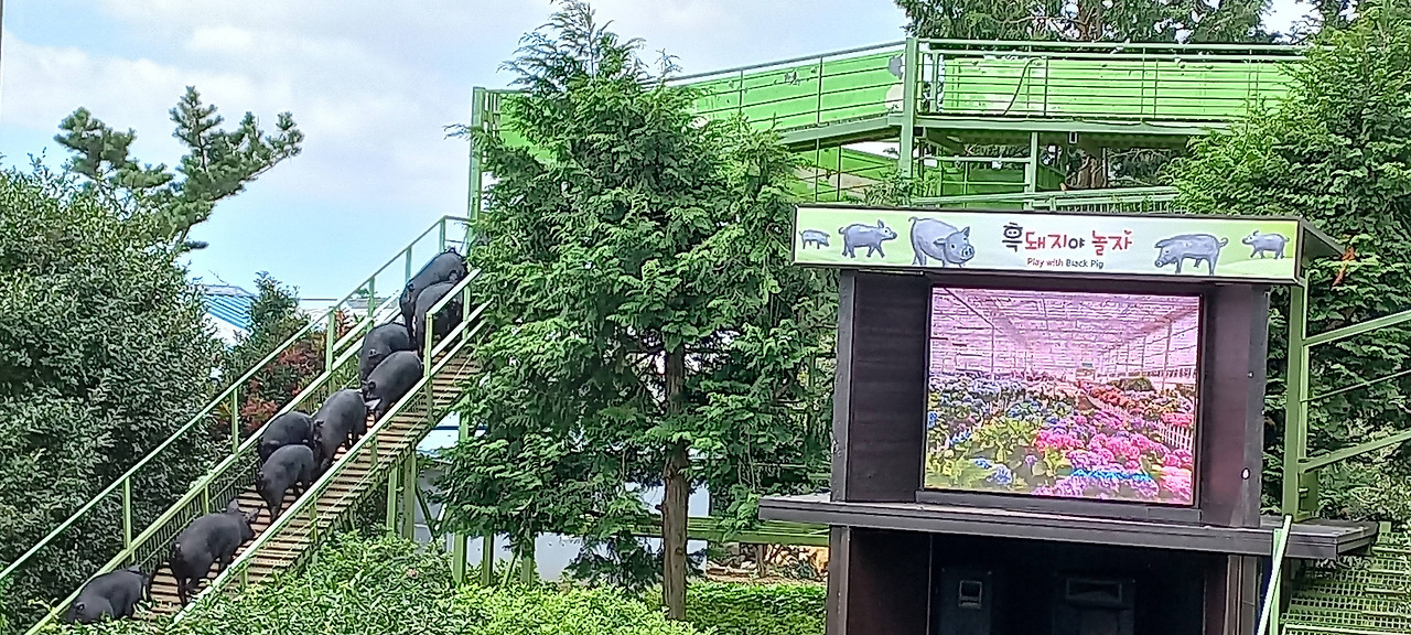 흑돼지 쇼를 하기 위해 계단을 오르는 돼지들