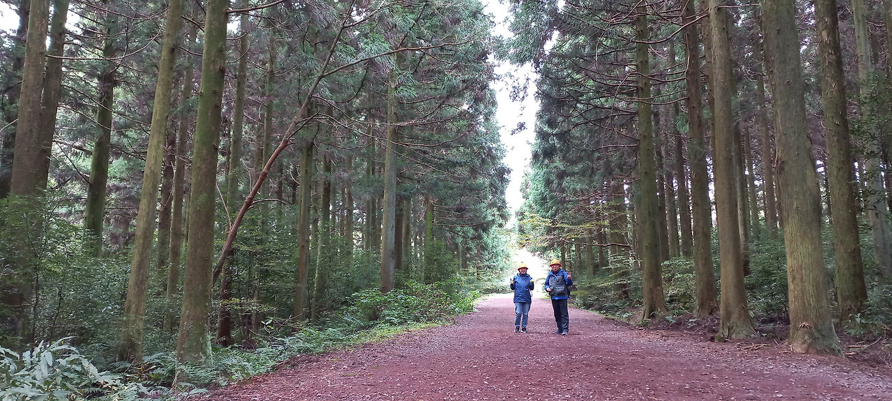 울창한 삼나무 사이의 데크로 이어진 길에서 나와 붉은 화산송이가 깔린, 길게 이어지는 숲길로 들어갔다. 걸으면서 잠깐씩 사진을 찍다가 오늘은 사진을 많이 찍지 않기로 했다. 끝을 모르게 높이 자란 주인공 삼나무들이 이끌어주는 숲에서 나무들과 호흡하며 걷고 싶었기 때문이다.