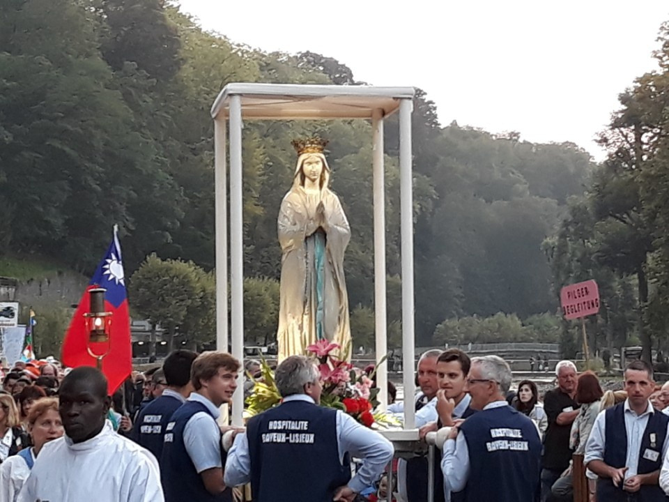 드디어 행렬이 시작되었다. 루르드 성모성상을 여러 장정이 틀 위에 올려 어깨에 메고 출발을 하면 그 뒤를 나라 별로 국기를 든 기수와 순례자들이 따른다.