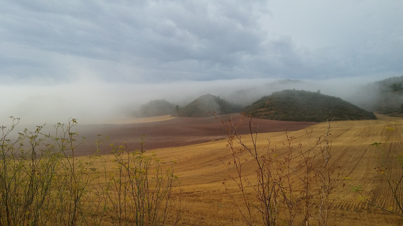 6시 50분에 몬 하르딘을 출발했다. 날씨도 선선하고 길도 평탄해서 단숨에(도중에 비가 와서 우비 입고) 로스 아르 꼬스까지 12.8km를 걸어왔다. 중간에 쉬지도 않고. 우리가 걷는 길 뒤로 안개가 피어올라 신비스러운 분위기 아래 태양이 떠오르면서 추수가 끝난 밀밭은 누렇게 황금색으로 반짝인다.