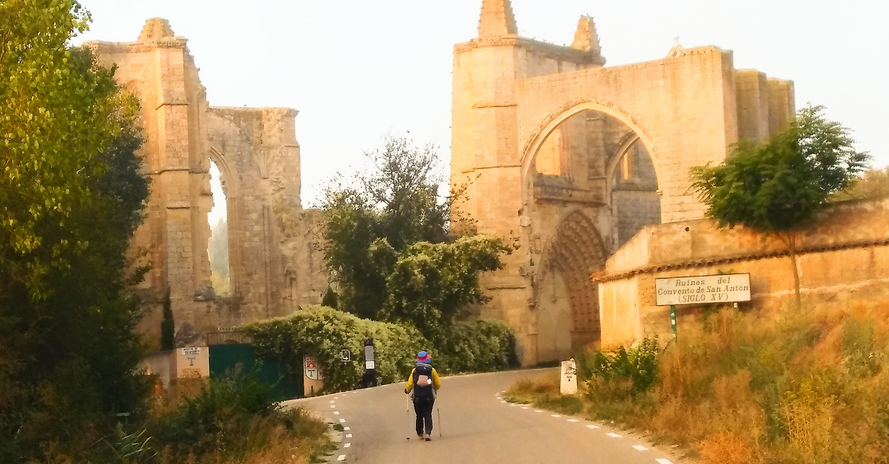 이른 아침 안개로 뿌옇게 보이는 들판을 까미노 표시를 보며 부지런히 걸었다. 해발 900미터인 온따나스(Hontanas)에서 800미터 이하로 완만하게 내려가는 들길을 걷다가 아스팔트로 길이 바뀌면서 직선으로 이어진 차도 옆을 걸었다. 차는 별로 다니지 않아 불편하지 않았다. 가다 보니 안내책에서 보았던 '산 안톤 수도원'의 모습이 안개가 거치며 환하게 나타났다. 커다란 아치 밑으로 차들이 지나갈 수 있도록 도로는 아스팔트로 포장되어 이어지고 있다. 중세 때 이 수도회의 수사들은 병에 걸린 순례자들을 극진히 돌보고, 또 도움이 필요한 순례자들에게 먹을 것과 잠자리도 제공해 주는 등 많은 도움을 주면서 까미노에 널리 알려졌었다고 한다. 지금은 남아있는 아치와 부서진 수도원 건물이 그들이 까미노에서 했던 일들을 웅변해주고 있다. 건물을 보는 것만으로도 수도복을 입은 수사가 친절한 미소를 띠며 어딘가에서 다가올 것 같다. 여러 사람의 희생과 도움이 산티아고 순례길에 남아있음을 다시 느끼게 한다.