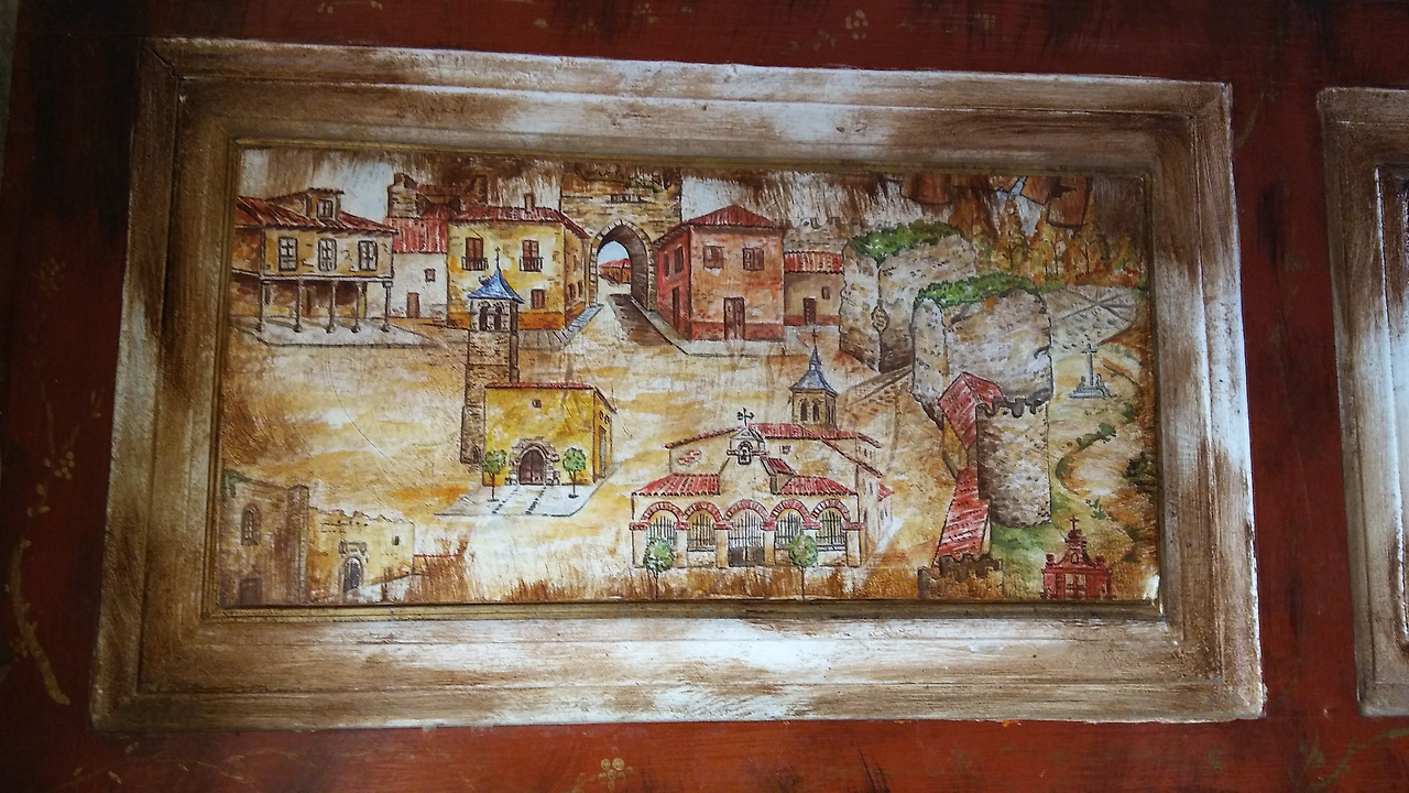 알베르게에는 몇 가지 그림이 걸려있었는데 이 그림은 마을의 모습을 잘 보여주고 있다. 마을을 감싸고 있는 낡고 오래된 성벽과 과거에는 성당이 여러 곳이었는데 지금은 2곳만 남아있다고 한다. 내일 아침에는 아마도 그림에서 보이는 저 아치문을 걸어 나가게 될 것이다.