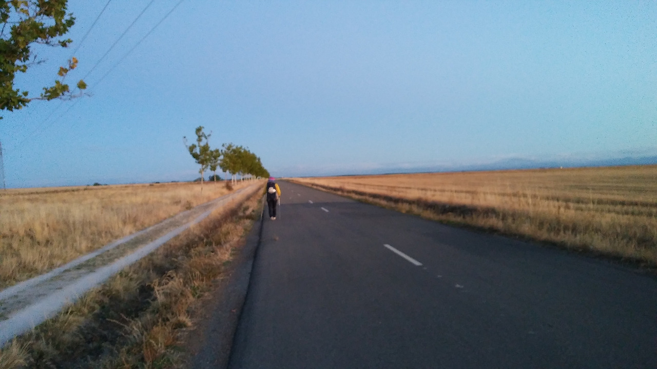 오늘도 13km 정도를 걸어가야 작은 마을을 만날 수 있다. 거기까지 이렇게 평탄하지만 아스팔트 차도를 걸어가야 한다. 양쪽으로 계속되는 추수 끝난 밀밭 평원과 파란 하늘이 만나는 지평선을 바라보면서 말이다. 다행히 자동차는 가끔 지나가서 소음이나 위험을 느끼지는 않는다.