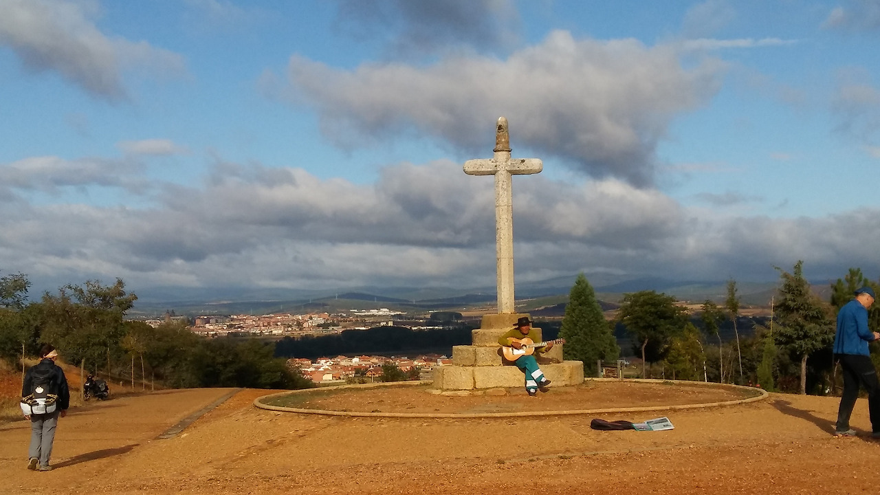 돌 십자가 밑에 앉아 기타를 치는 사람을 보고 있자니 저쪽 숲길에서 순례자들이 계속 올라왔다. 그 사람들을 보니 그 길은 우리가 걸어온 길 보다 차도를 피해 조금 우회해서 걸어야 했던 것 같았다. 아쉬워하는 나를 위로하듯 그 교수는 돌 십자가 앞에서 남편과 나의 사진을 찍어주었다.