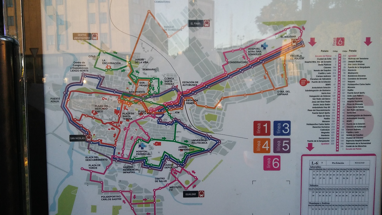 버스에서 잠깐 졸았다고 생각했는데 어느새 오후 6시다. 서둘러 아빌라 구도심으로 들어가기 위해 도로를 건너 조금 걸어가니 정류장이 있었다. 버스노선표가 색깔별로 그려져 있고 도착시간도 표시되어 있다.