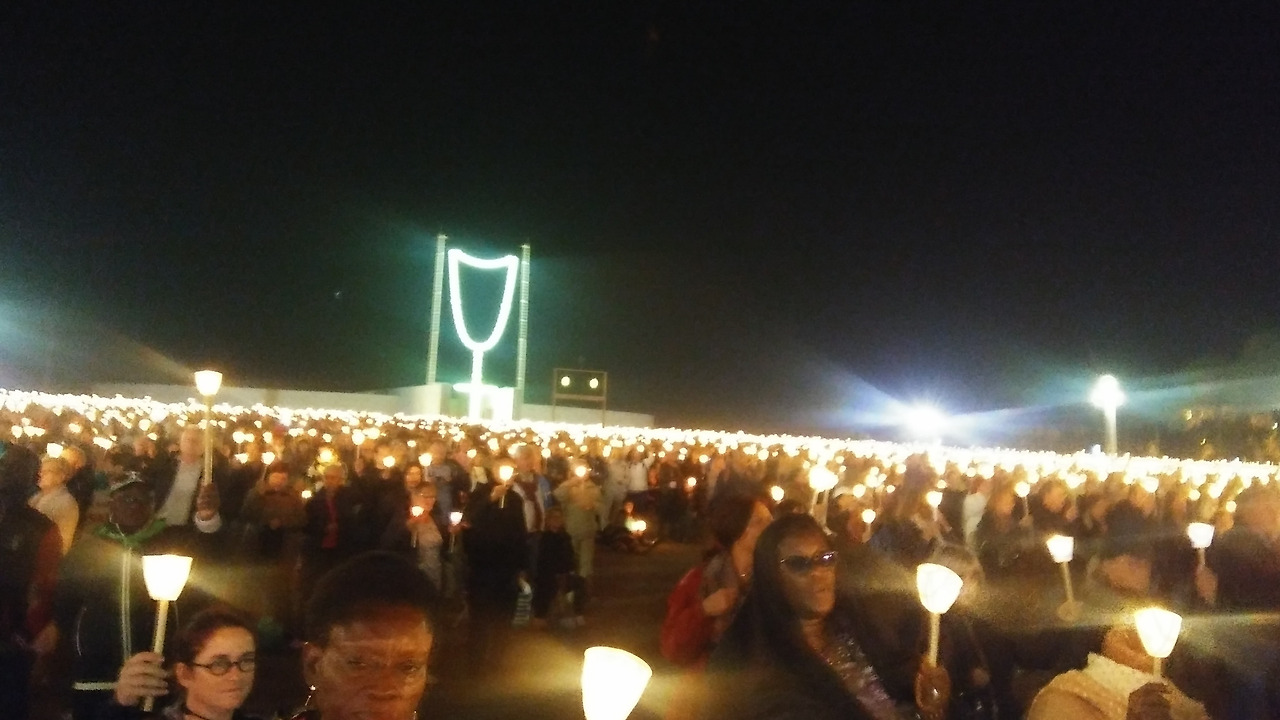 발현 성당에서 출발한 성모 행렬이 성삼위 대성당 앞의 하얀 대리석 길을 지나 로사리오 대성당 앞에 있는 야외 제대의 왼쪽으로 올라와 미사가 시작되기까지 대성당의 성가대가 성가로 아름답게 불러주는 묵주기도 신비의 선창에 맞추어 광장에 모여있는 각국의 신자들은 촛불을 들고 아베마리아를 합송 했다.