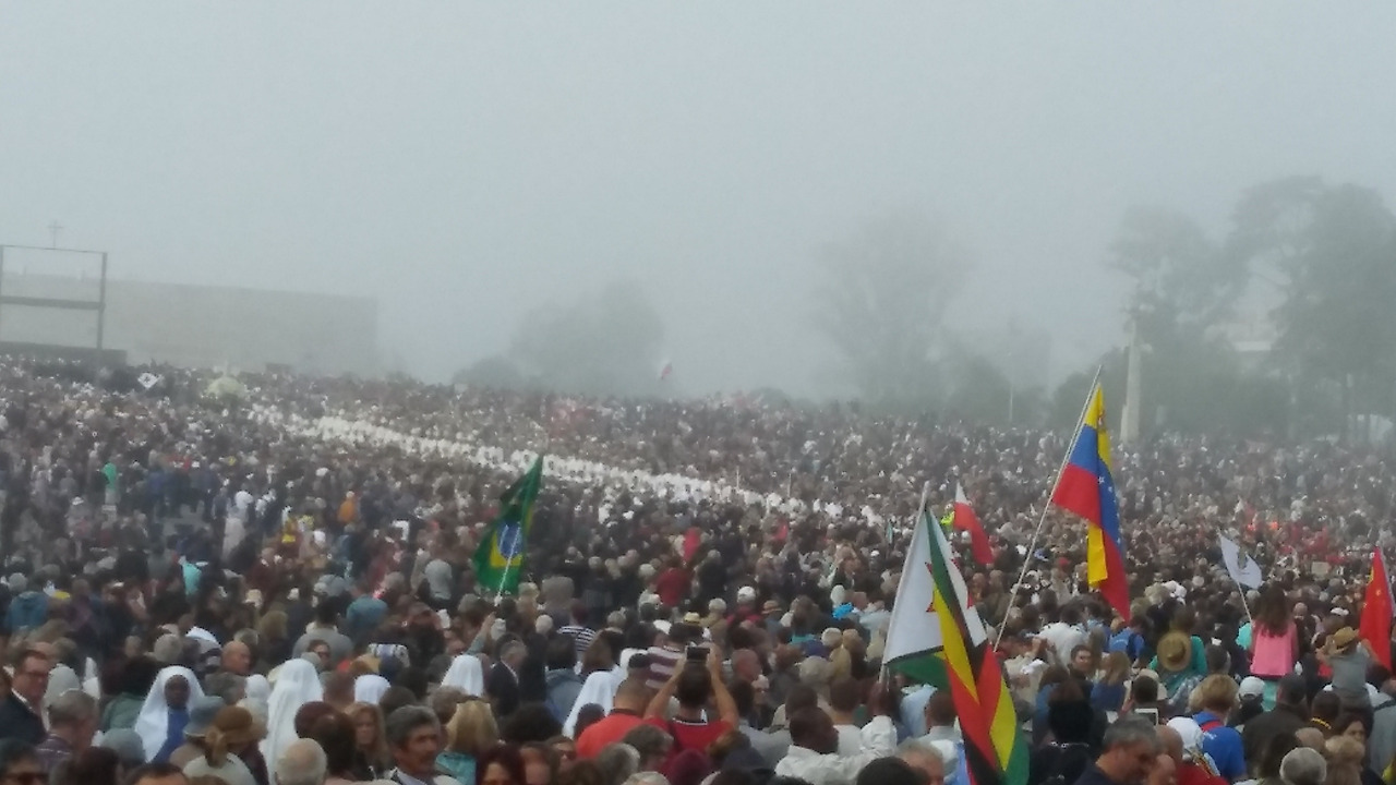 아침에 준비하고 100주년 기념일 미사에 참석하기 위해 다시 성지 광장으로 나갔다. 미사가 시작되기 전 갑자기 구름인지 안개가 가득히 성지를 에워쌌다. 로사리오 대성당도 보이지 않고 반대편의 성삼위 대성당도 보이지 않는다.