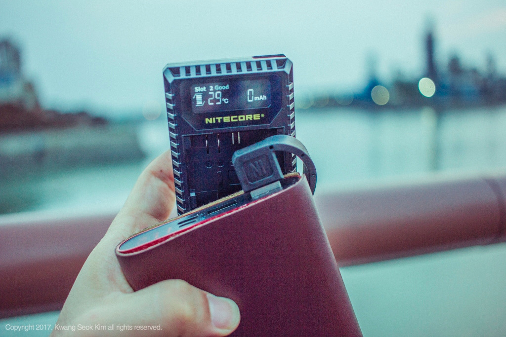 사용방법은 간단했다. 카메라 배터리를 연결하고 그것을 보조배터리나 컴퓨터, 노트북 등 USB에 연결하면 충전이 시작됐다. 충전량과 온도를 확인할 수 있는 창도 있어서 완충이 급하게 사용해야 할 때 용이했다. 또한 스마트폰 배터리보다 발열에 민감한 카메라 배터리 특성상 온도가 표시되는 기능은 굉장히 반가웠다. 그리고 오늘 드디어 이녀석을 들고 출사를 나간다. 배터리 한 개와 예비 배터리 한 개를 모두 완충하고 이녀석을 가방에 넣었다. 에너지 무한팩 치트키를 친것처럼 든든하다.