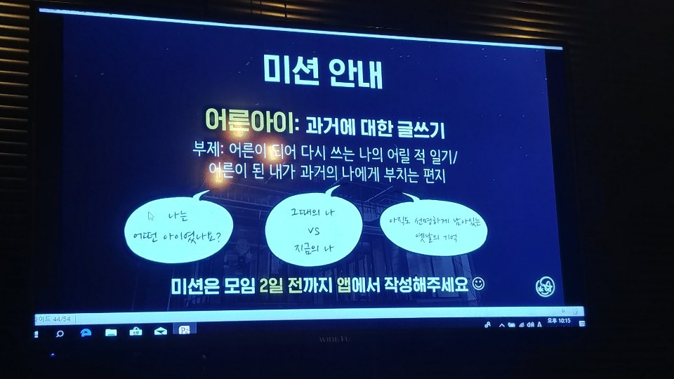 크리에이터 클럽, 나를 쓰다 팀 정기모임에 참여하니 이런 화면이 우릴 맞이했다.