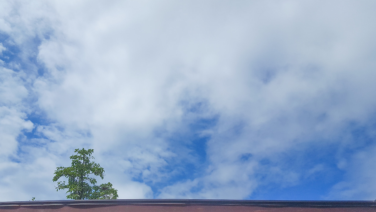 사무실 앞 정자 지붕 위로 나무가 빼꼼 나왔다