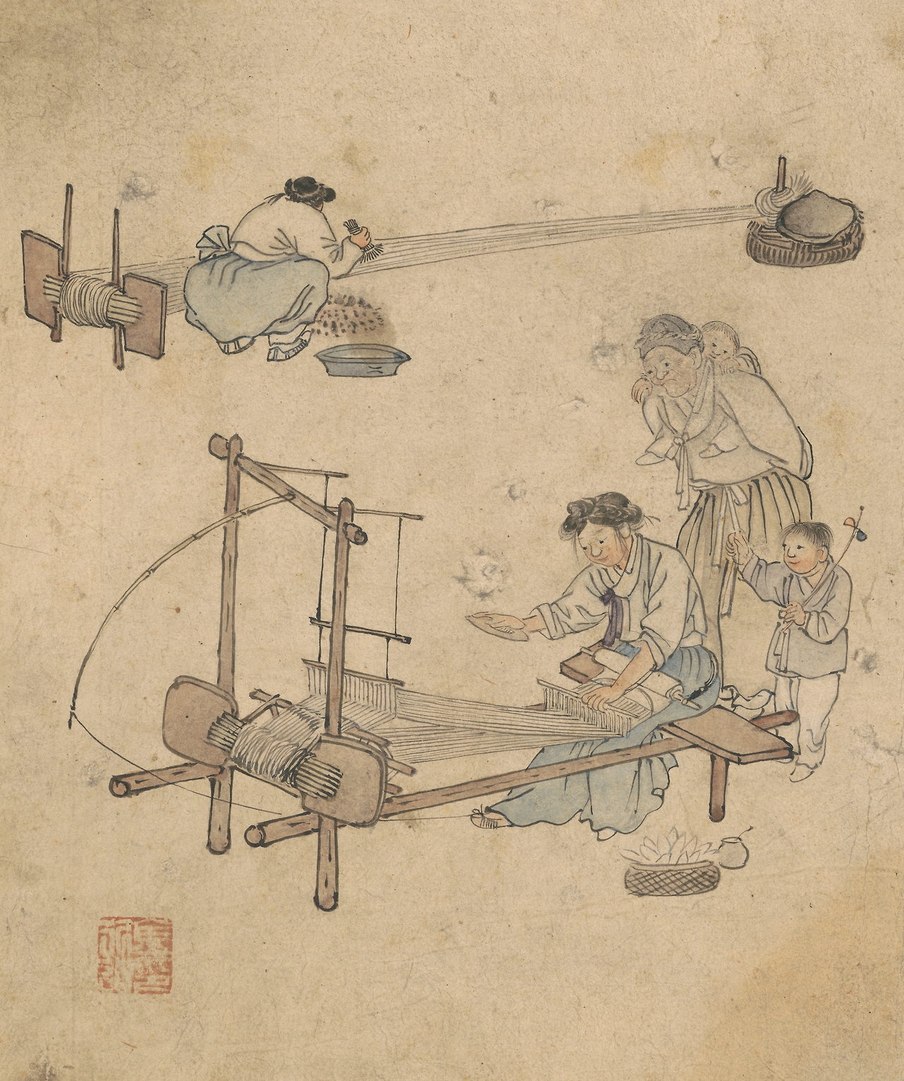 베틀에서 길쌈하는 아낙네를 바라보는 아이와 아이를 업고서 이를 바라보는 나이 지긋한 할머니 (출처: 국립중앙박물관)
