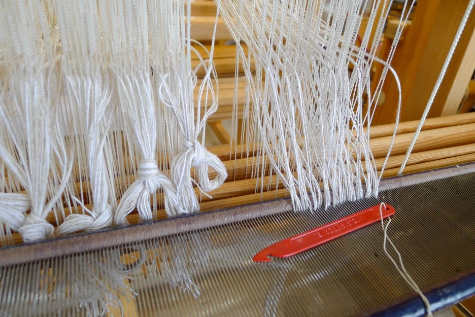 세로실을 바디에 끼운 후 직조기로 가져온 후 뒤에서 앞으로 옮기는 중