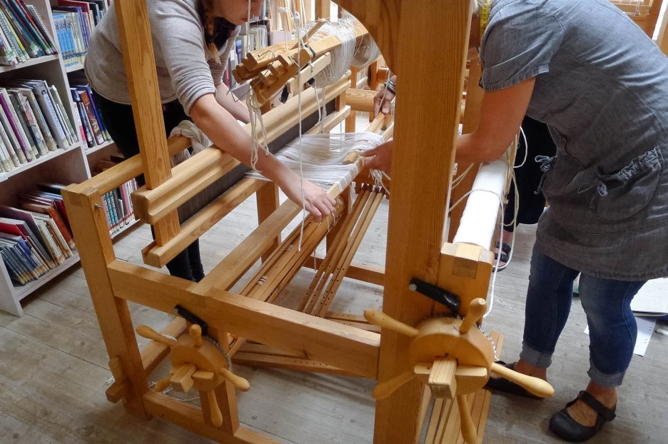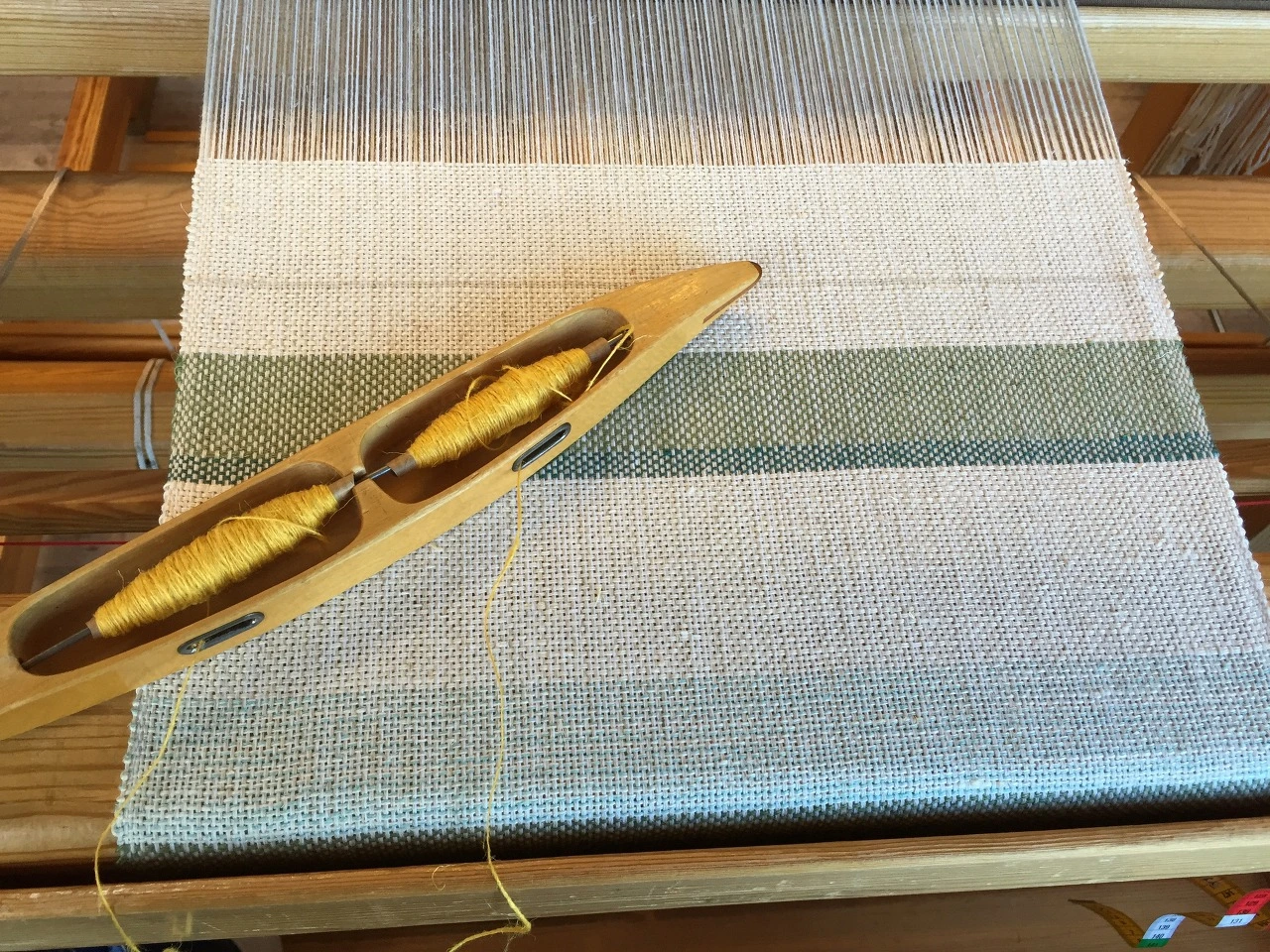 김홍도의 길쌈에 나오는 저 아낙네(!)처럼 저런 모습으로 가로실을 왼쪽에서 오른쪽, 오른쪽에서 왼쪽, 다시 왼쪽에서 오른쪽 왔다 갔다 하면 금세 천이 만들어진다. 실제 위빙은 수월하게, 오랜 시간을 들이지 않고 끝났다.