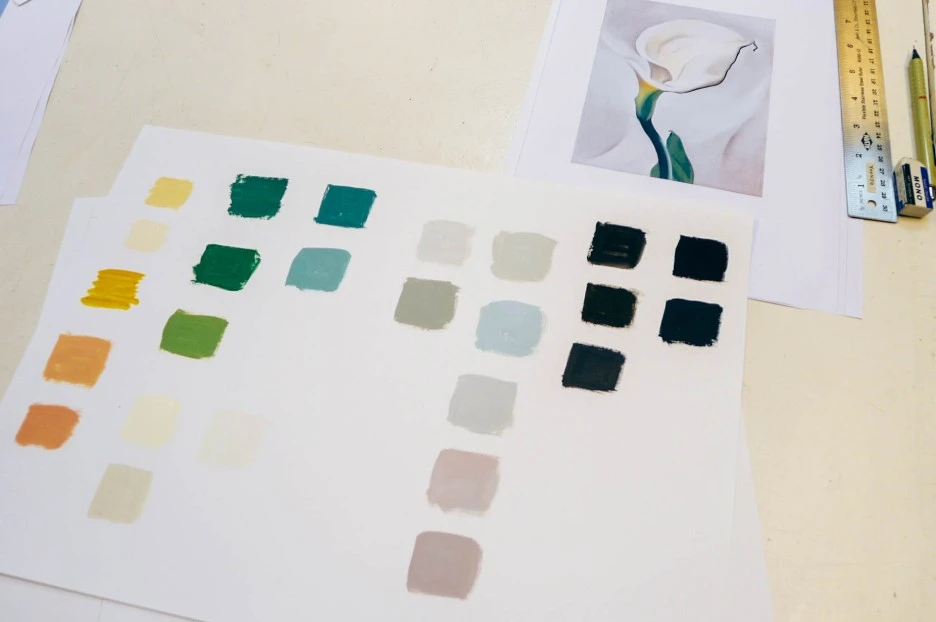 먼저 세 명의 여성 아티스트의 작품 중 좋아하는 그림을 하나 골라 컬러 팔레트를 만든다. 팔레트에서 쓰인 색으로 줄무늬 패턴을 만들고 실을 골라 직조기로 가방을 짠다. 내가 고른 그림은 조지아 오키프의 그림이다. 원래 조지아 오키프를 좋아하기도 했고, 가방은 특히 튀는 색을 좋아하지 않아서 일부러 무난해 보이는 색의 그림으로 정했다. 그림에 쓰인 색들을 물감으로 만들어 도화지에 그려 팔레트를 만들고 이리저리 줄무늬 패턴을 그려보았다. 그리고 두근두근 재미있는 시간이 왔다. 형형색색, 코튼부터 린넨, 실크 등 다양한 종류의 실들을 보고 직조할 천을 만들 실을 고른다. 고르기가 끝나면 드디어 꿈만 같은 직조기를 가지고 놀 시간!