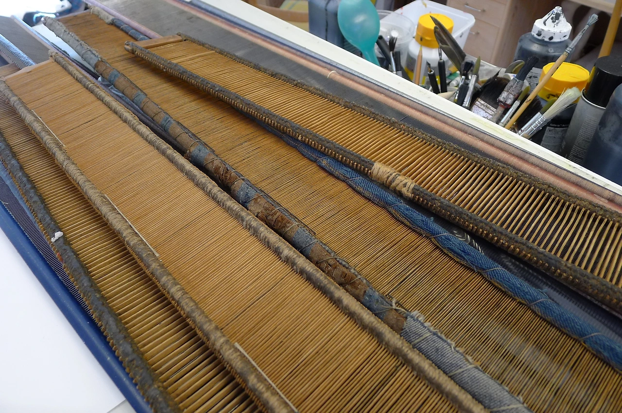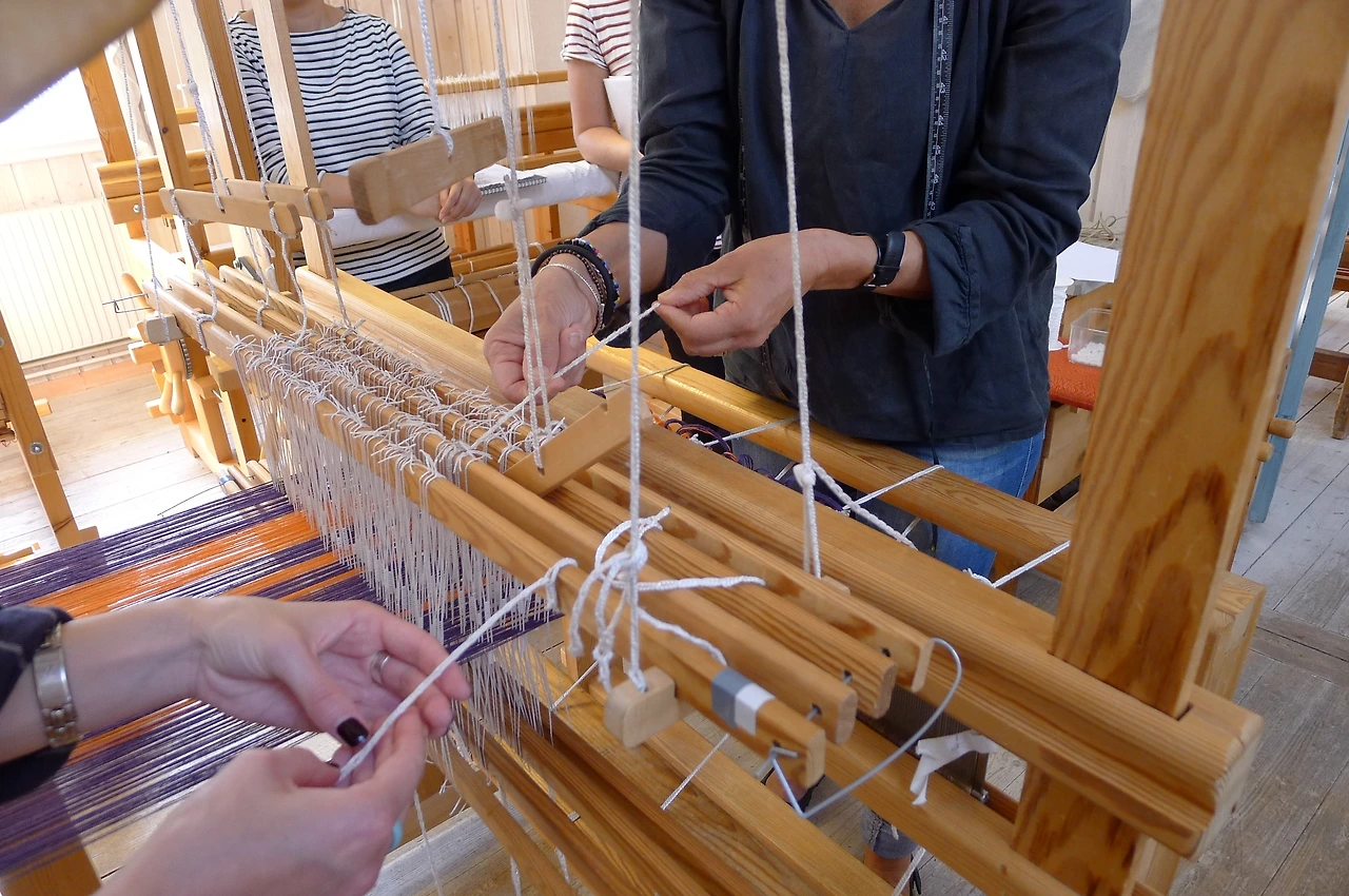 한국에서 위빙 스튜디오를 찾아 몇 번 수업을 들어보긴 했다. 너무 재미있어서 중고로 나온 자그마한 4종광 직조기도 사놓고 내가 디자인한 멋진 직물을 꿈꿔보며 작은 샘플들을 만들어보기도 했다. 그러나 이렇게 큰 직조기는 처음이었다. 두 명, 혹은 세 명이 도와서 직조기 한쪽에서 다른 쪽까지 실을 보내고 줄다리기를 하는 것처럼 팽팽하게 당기며 온 힘을 써서 세팅을 해야 했다.