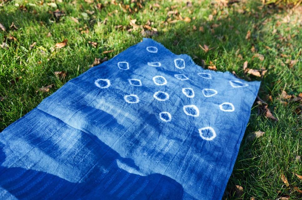만들어진 인디고 염료 통에 염색할 것을 넣었다 꺼낸다. 얼마나 담가 둘 것인지는 몇 초부터 몇 분, 혹은 몇십 분까지 원하는 디자인과 그날그날 인디고 상태에 따라 달라서 많은 테스트와 인내심이 필요했다. 통에 담갔다 꺼내면 처음에는 초록색이던 염색물이 공기와 만나 산화되면서 점점 파란색이 나오는데 그 과정이 정말 신기하다.