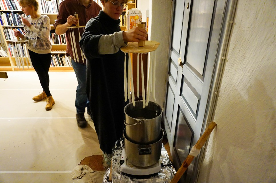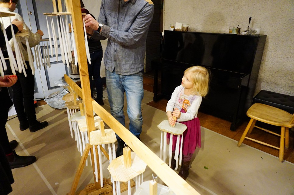 향초 만들기도 해 본 적 없는 나는 이런 기다란 양초를 직접 만드는 것이 쉽게 상상이 가지 않았다. 과정은 의외로 간단해서 나무판에 달린 양초 심지를 솥 안에 들어있는 뜨거운 초 액체에 담갔다 꺼내면 된다. 한번 꺼낸 초는 다시 빈자리에 매달아 놓아 굳힌다. 이 과정을 여러 번 반복하다 보면 점점 초 모양이 되는데 한 번씩 담그고 식혀야 하기 때문에 시간이 오래 걸린다. 두세 시간은 걸려야 웬만큼 촛대에 꽂을 수 있는 크기가 된다고 한다. 하지만 여긴 카펠라고든, 수공예의 학교에서 양초쯤이야!