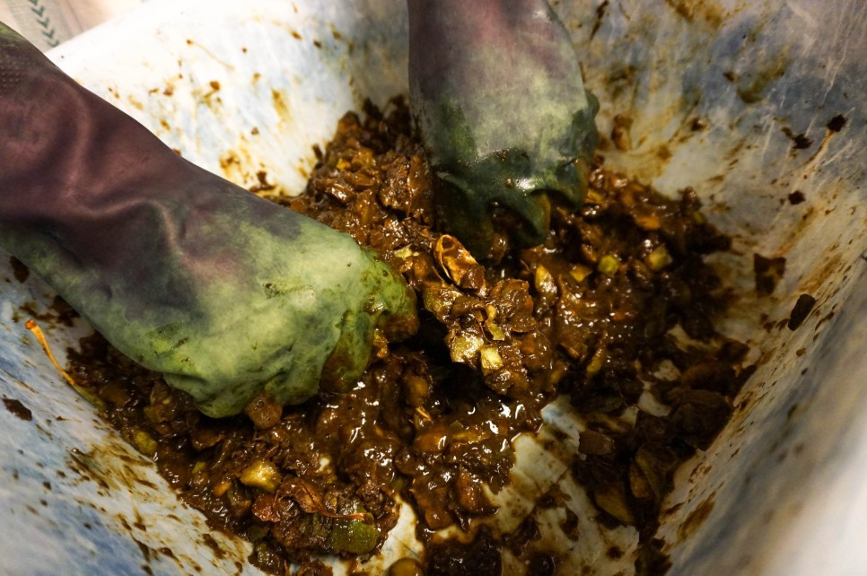 호두 열매는 연두색으로 크기는 자두보다 작다. 말랑한 껍질 안에 단단한 호두가 들어있고, 단단한 호두껍질을 벗겨야 먹을 수 있는 호두가 있다. 염색이 가능한 부분은 가장 바깥의 연두색 부분이다. 비가 많이 오는 날씨 탓에 이미 껍질 부분이 많이 물러져서 낙엽이 섞였다. 모아 온 호두껍질을 손으로 무르게 만든다. 장갑을 잊어서는 안 된다. 호두껍질은 한번 손에 물들면 인디고보다도 오래간다. 맨손으로 하다가는 적어도 2주는 손이 온통 갈색이 되어 안 씻는 사람처럼 보일 수 있으므로 주의!