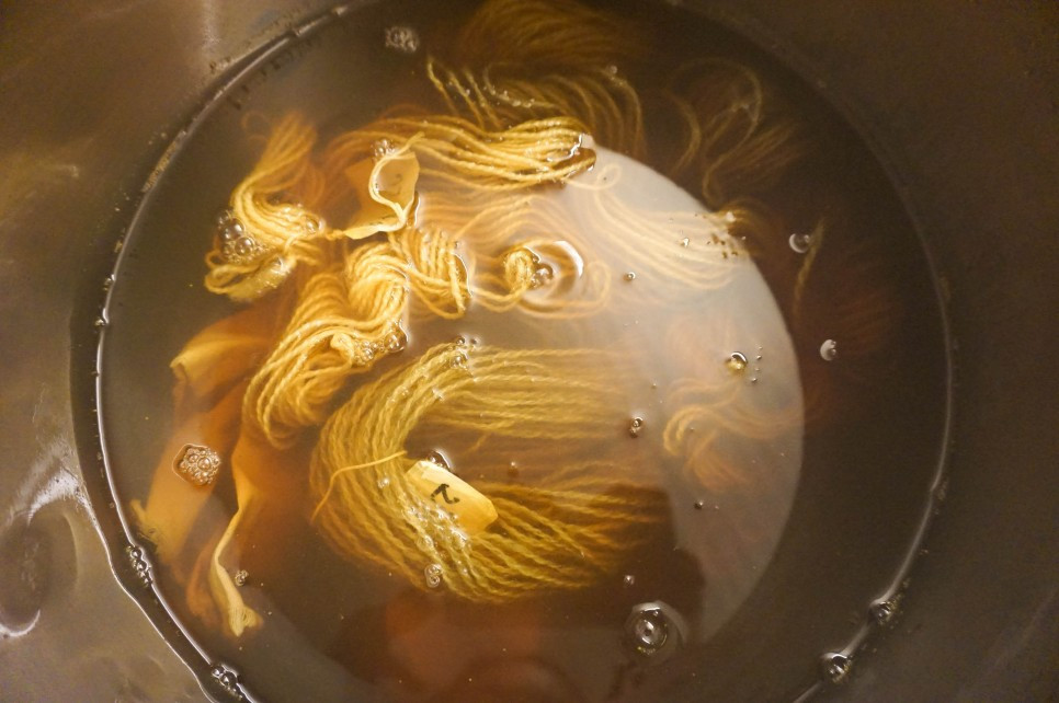 이제 드디어 천을 끓인 염료에 넣을 차례다. 선매염한 울 실과 천을 넣고 다시 90도에서 끓인다. 점점 실이 노랗게 변하는 것을 볼 수 있다. 한 시간 후 염색된 실을 꺼내서 물에 여러 번 헹구어 말린다.
