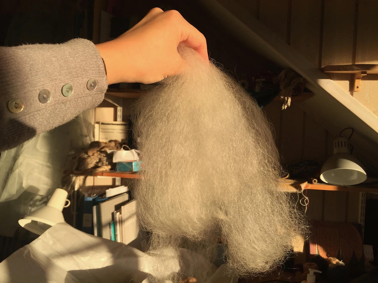 이번 워크숍 주제는 털실로 실 만들기다. 이제 실로 뭔가를 만드는 건 나름 해봤지만 양털로 실을 만드게 될 줄이야! 지난번 귀닐라버그에서 직접 가위로 깎은 양털을 사용해 실을 만들어 보기로 했다. 레나의 워크숍이 있기 전 주말 따듯한 물에 담가 헹궈서 잘 말려놓았다.
