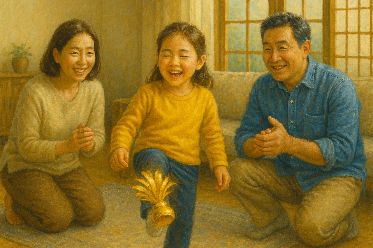 온몸이 녹초가 되어 소파에 기대고 싶은 찰나, 초등학교 3학년 딸아이가 반짝이는 금빛 제기를 들고 TV를 보면서 제기를 찬다. 곧 땅에 떨어진 제기를 들고 천진난만한 눈으로 말한다.