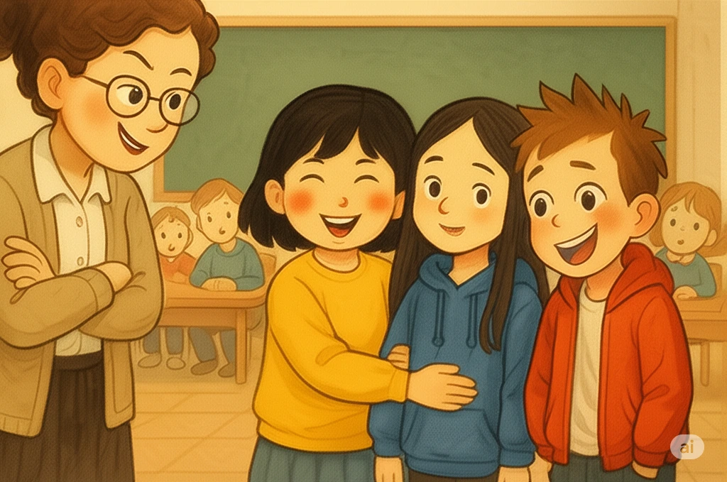 그 순간! 선생님이 돌아봤고 아이들을 향해 소리쳤어요.