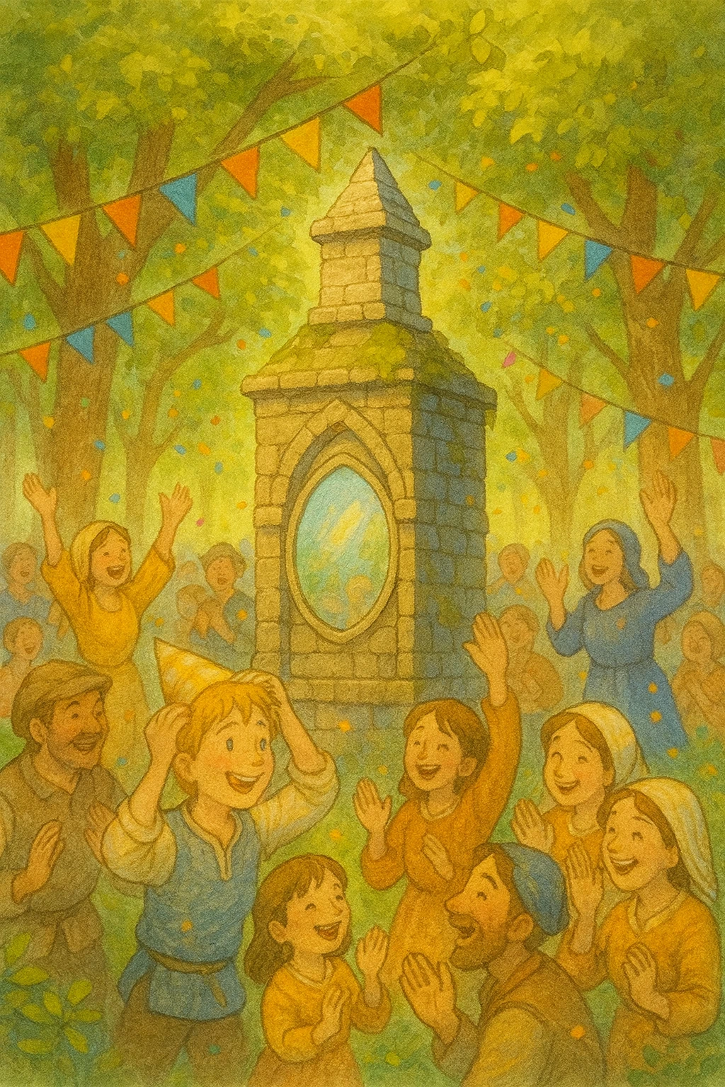 며칠 후, 마을은 거울탑 앞에서 축제를 열었다.