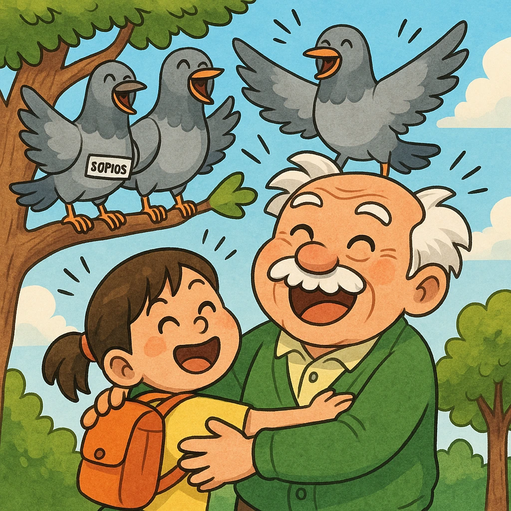 비둘기 가족은 공원 벤치에 앉은 한 할아버지를 내려다보며 서로 속닥거렸다.