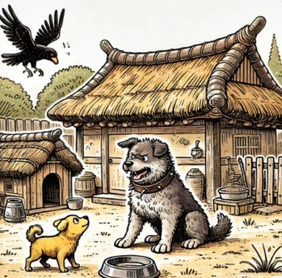 "까~악! 오늘도 잘 먹을게, 똥개 누렁이!"