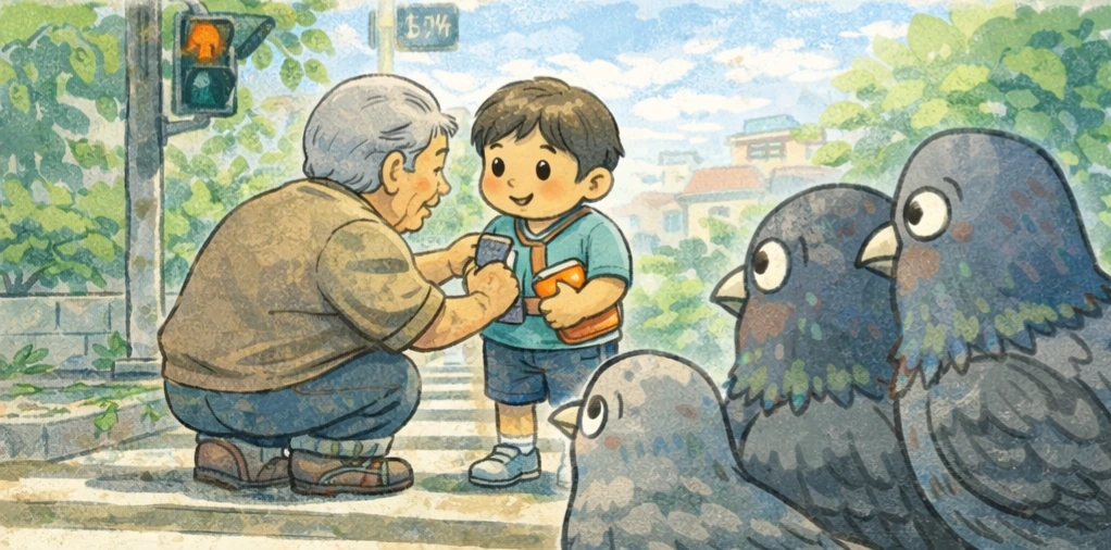 신호등 앞에서 손자가 멈추자