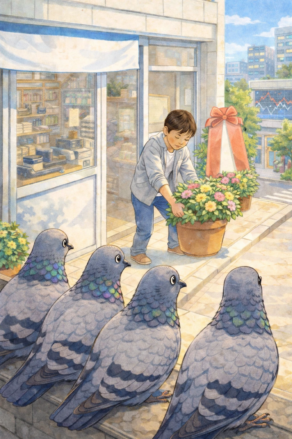 청년은 가게 앞에 '축 개업' 화분을 햇빛이 가장 잘 드는 자리로 조심스럽게 옮겨 놓고 있었다.
