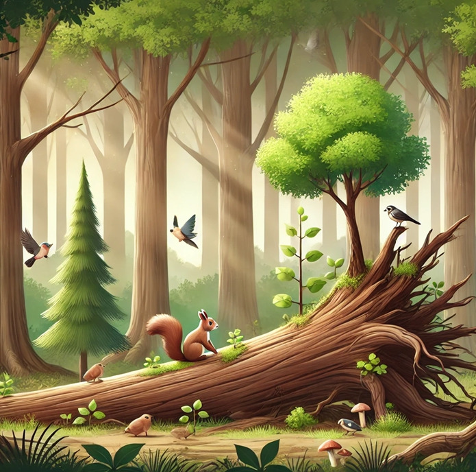 하지만 시간이 지나자 신기한 일이 벌어졌어요. 쓰러진 나무 주변으로 작은 동물들이 하나둘 모이기 시작했어요. 새들은 쓰러진 나무 위에 둥지를 틀었고, 다람쥐들은 나무 틈에 숨겨둔 도토리를 찾아 즐겁게 뛰어다녔어요. 그리고 어린 나무들이 쓰러진 나무의 그늘 아래에서 조용히 새싹을 틔웠어요.