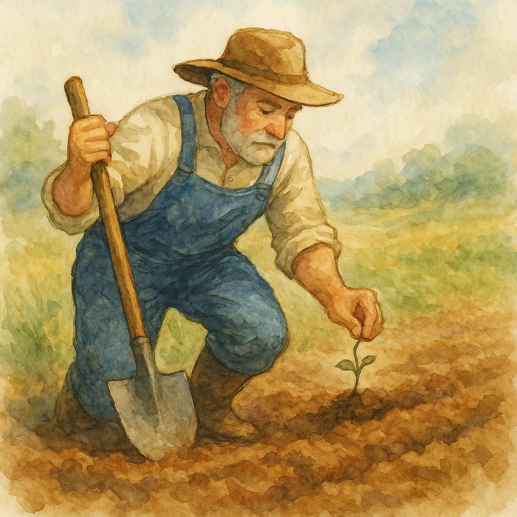 농부는 쓰러진 나무 옆에 새 씨앗을 심었다. 그리고 마음속 돌덩이가 조금씩 가벼워지는 걸 느꼈다.
