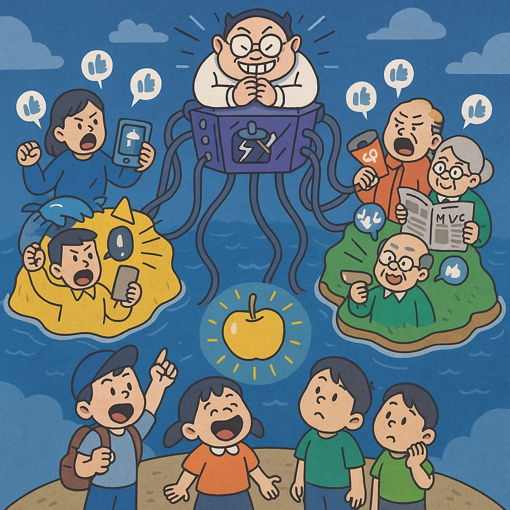 이 동화는 현대 사회에서 알고리즘 기반의 정보 소비가 어떻게 사람들의 사고와 감정을 편향시키고, 사회를 분열시키는지를 풍자적으로 그려낸 이야기입니다.