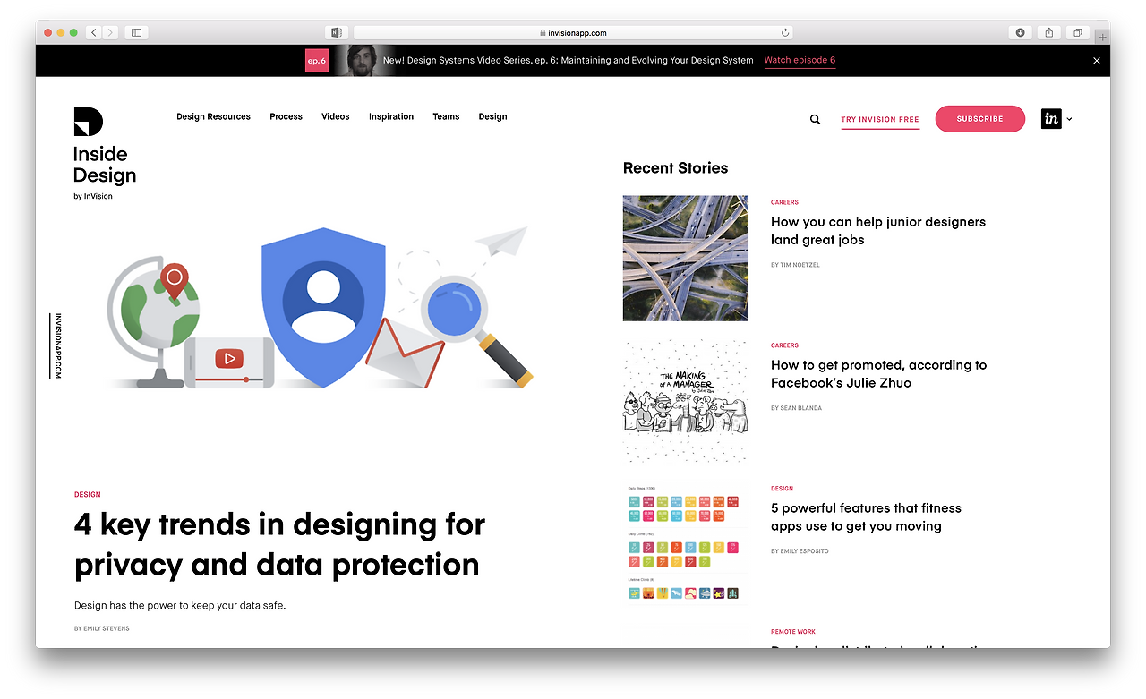 프로토타입/협업 툴인 InVision에서 운영하는 디자인 블로그. 트렌드, 앱 리뷰, 디자인 사례, 디자이너로서의 커리어 등 다양한 주제의 좋은 아티클을 접할 수 있다.