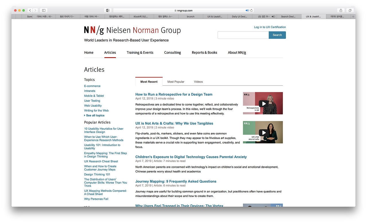 사용자 경험(UX) 분야를 개척했다는 도널드 노먼(Donald Norman)과 제이콥 닐슨(Jacob Nielsen) 선생님이 만든 UX 리서치 조직(?)인 Nielsen Norman Group의 블로그. 'Articles' 카테고리에서 우리가 실무하면서 겪는 다양한 고민들에 대한 리서치 결과들을 찾아볼 수 있다. 논문처럼 선행적이거나 복잡하지 않으면서 동시에 특정 채널에 국한되지 않은 정성적/정량적인 리서치 결과를 볼 수 있어, 실무적인 판단의 근거로 삼기에 좋은 글들이 많다.