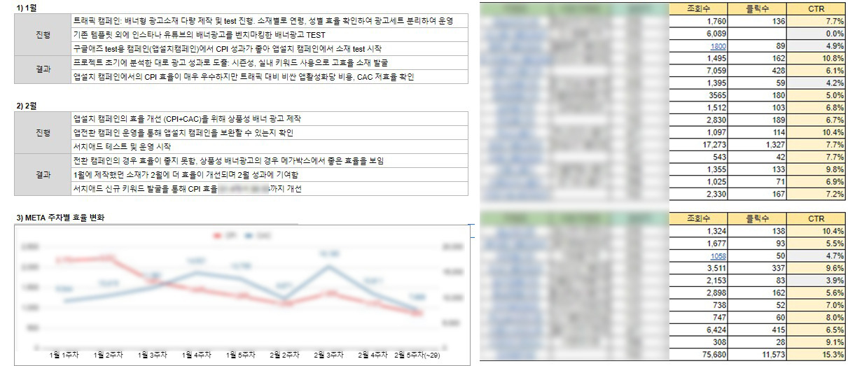그래서 신중해야 하는 부분은 신중하게, 빠르게 해야 하는 부분은 빠르게 진행하려고 노력하고 있어요. 제가 고민해서 만든 소재보다 다른 소재를 벤치마킹해서 빠르게 만든 소재가 훨씬 성과가 잘 나오기도 하더라구요. 그래서 작년에 처음 소재를 만들 때만 해도 전부 실패했는데, 1년이 지난 지금은 소재도 발굴하고 광고 운영도 효율적으로 할 수 있게 되었어요.