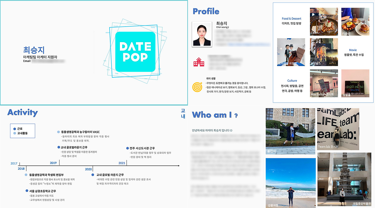 지난 대터뷰에서는 성실의 아이콘 로컬매니저와 인터뷰를 진행했다면, 이번에는 데이트팝 마케터를 모셔봤습니다. 비전공자인데도 마케팅에 대한 열정 하나로 성장해 오셨는데, 처음에는 부여 받은 일도 방황하다가 이제는 어엿한 기획부터 실행, 결과 분석까지 해낼 수 있는 마케터 승지님과의 인터뷰 시작합니다.