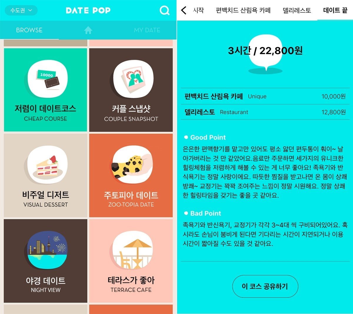 데이트팝의 초창기 모습은 이게 맞는 것 같다. 커플이라는 유저에게 너무나도 좋은 데이트 코스 컨텐츠를 제공하고, 쉽게 볼 수 있는 모바일 앱으로 제공되는, '좋은 서비스'가 맞다. (다만 완벽한 이라고는 표현하지 않겠다. 아직 디벨롭할 것들이 많으니.)