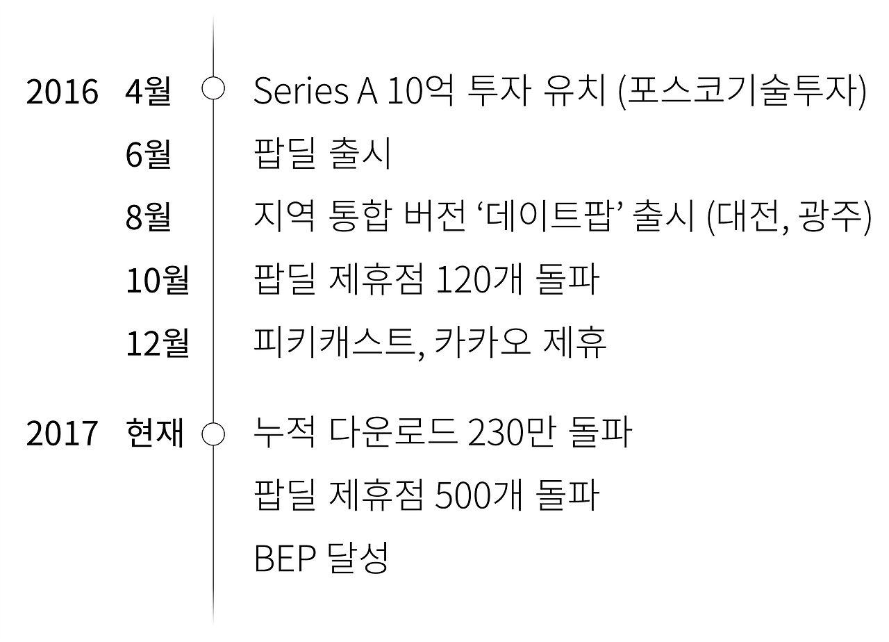 2013년~2014년에 많은 스타트업이 생기고, 데이트팝은 서비스 출시 6개월 만에 첫 투자를 받았다. (관련 기사) 투자는 사업의 시작도 끝도 아님을, 계약서 도장 찍은 그날부터 알게 되었지만 어쨌든 아무것도 없는 우리 팀이 사업을 할 수 있게 된 씨앗이 된 것은 분명하다.