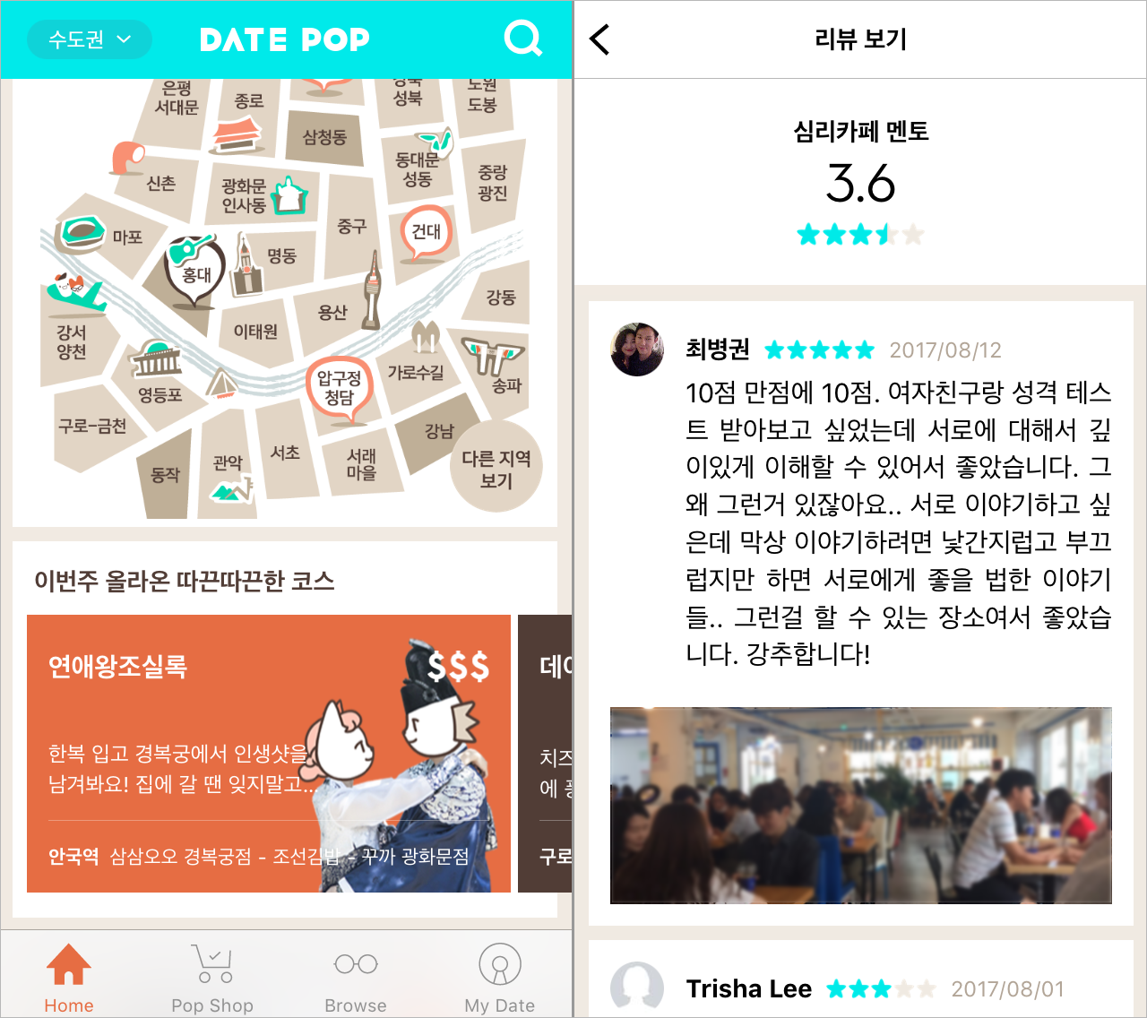원래 데이트팝은 데이트하기 전, 색다른 놀거리가 포함되어 있고, 더 생각할 필요 없이 하나의 코스로 제안해주자는 컨셉으로 시작한 컨텐츠 서비스였다. 초기 기획은 친근한 분위기의 매거진을 지향했다.