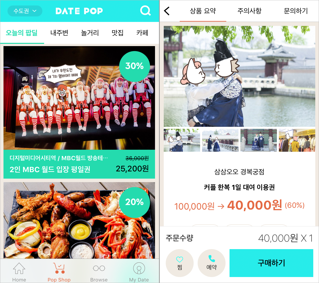 O2O로 전환하면서 서비스 단에서 큰 변화는 유저들이 인기 데이트 장소를 할인가에 구매해 갈 수 있는 '팝딜'이 생겼다는 것이다. 그래서 원래는 컨텐츠 탐색(browse)에 최적화해서 구축해놓은 서버 구조와 UI였으나, 결제 기능을 구현하고 안정적으로 커머스 서비스를 하기 위해서 개발팀이 많은 노력을 했다. (라고 쓰고 많이 싸웠다,라고 읽는다.)